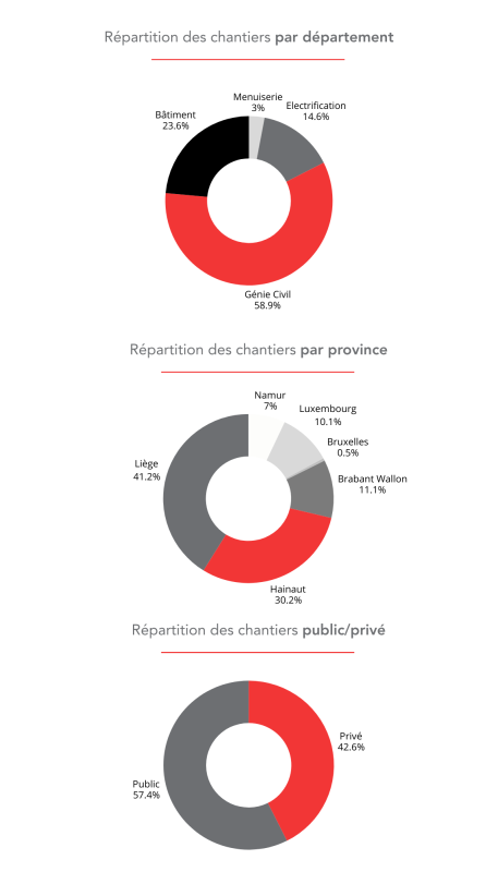 Afin de mener à bien nos projets, nous disposons d'un pool de plus de 250 ouvriers encadrés par un staff compétent de conducteurs et gestionnaires de chantiers. En soutien à ces équipes d'exécution, nous disposons en notre sein de services de spécialistes : Bureau d'études - Bureau méthodes & planning - Service achats - Service topographique - Service QSE.