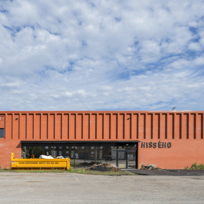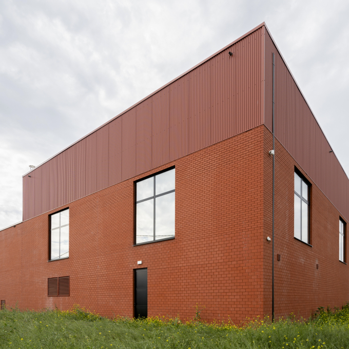 - Bâtiment construit en maçonnerie avec bardage en brique.